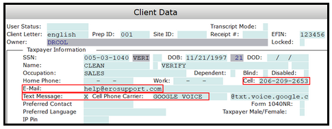 - Taxpayer/Spouse cell phone number and cell phone service provider information in the "Client Data" screen for text messaging. Email in the Desktop Tax Program can also be used for remotely capturing a signature provided there is an email present in the "Client Data" screen.