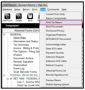 - From the Print menu, Select Final Tax Return.