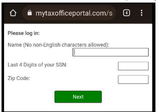 - After clicking the web link from the text message, a web browser window will open and the Taxpayer/Spouse will need to verify their identity by completing the information for Last Name, DOB, Last 4 digits of their SSN, & possibly Zip Code. Click Next to continue.
