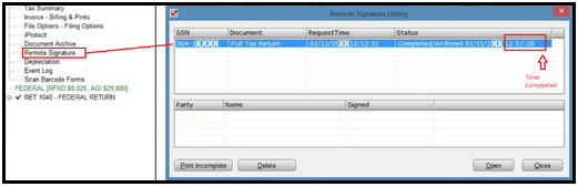 - The signature is transferred and integrated with the return. When the return is open, the signature can be viewed under Attached Forms/GENERAL by selecting Remote Signature. The time completed is notated at the very right.