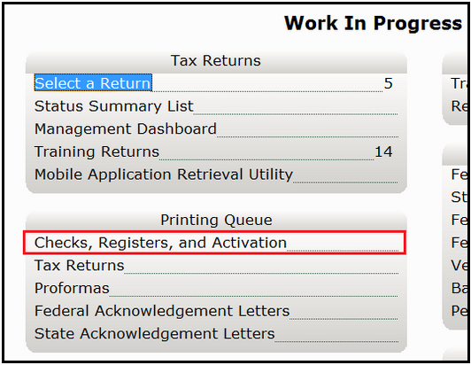 1. From the "Work in Progress" screen, in the Printing Queue panel, select Checks, Registers, and Activation.