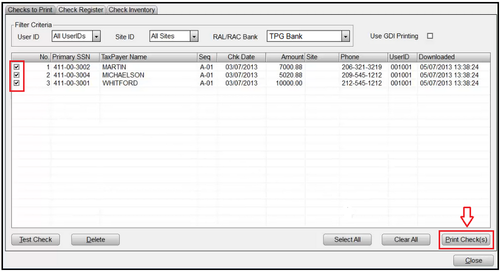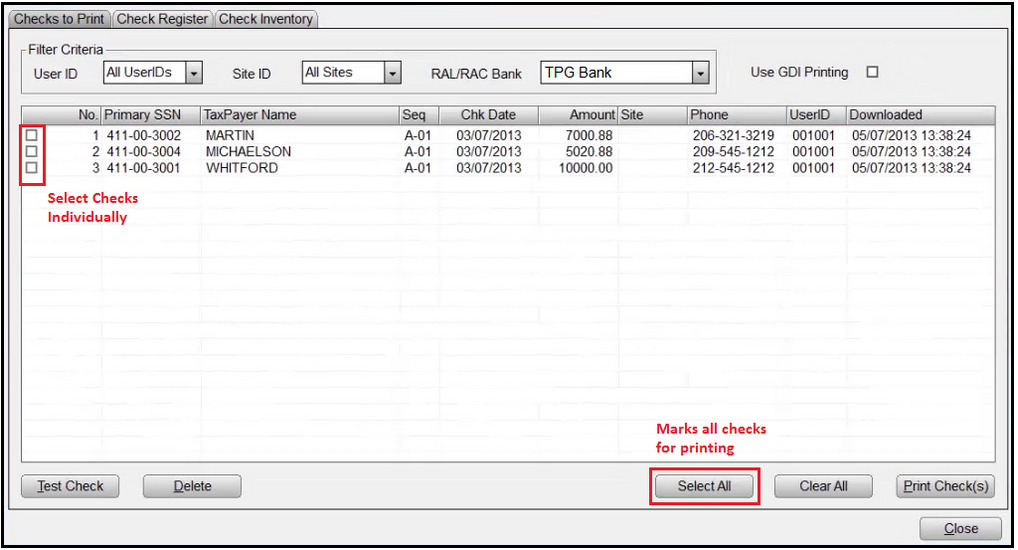 3. Select the box next to each check to be printed, or click Select All to mark all the checks for printing.