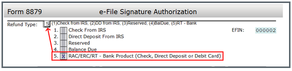 - Once a bank product is selected on Form 8879 (Refund Type "5")