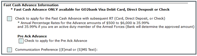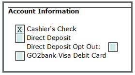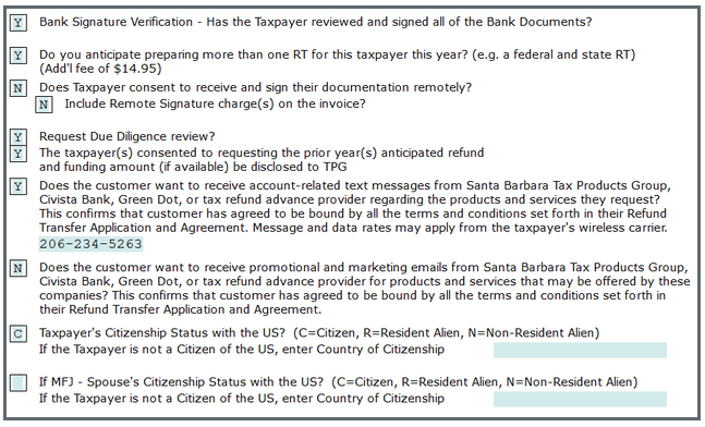 All check boxes need to be reviewed by the ERO and selected in the order defined by each field.- For example: The field "Bank Signature Verification" will need to be checked after the bank application has been printed and signed by the taxpayer and spouse, yet before the application is to be transmitted.