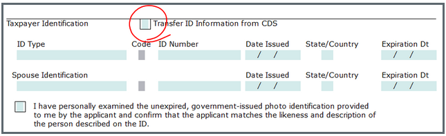 Due diligence requirements, enter taxpayer and spouse identification information here.- Use the Transfer ID Information from CDS to use data entered on the client data screen.