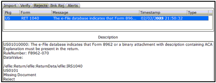 IRS Rejection: The e-File Database indicates that Form 8962 or binary attachment with description containing ACA Explanation must be present in the return.